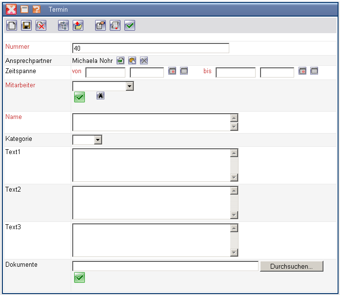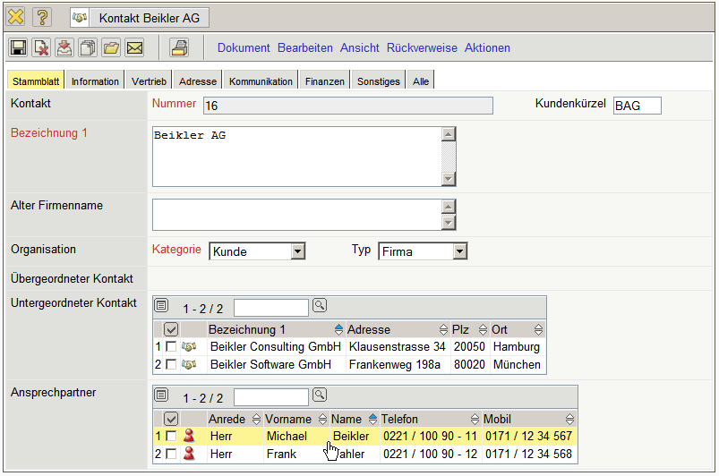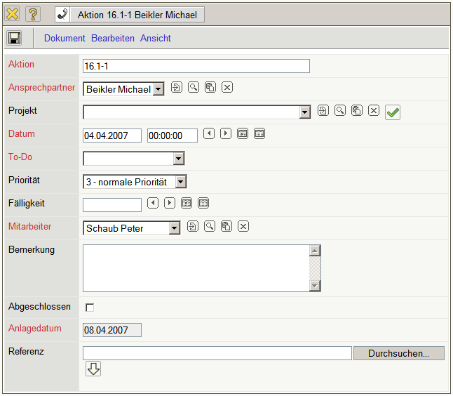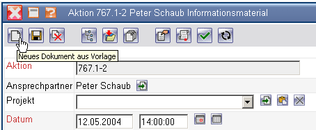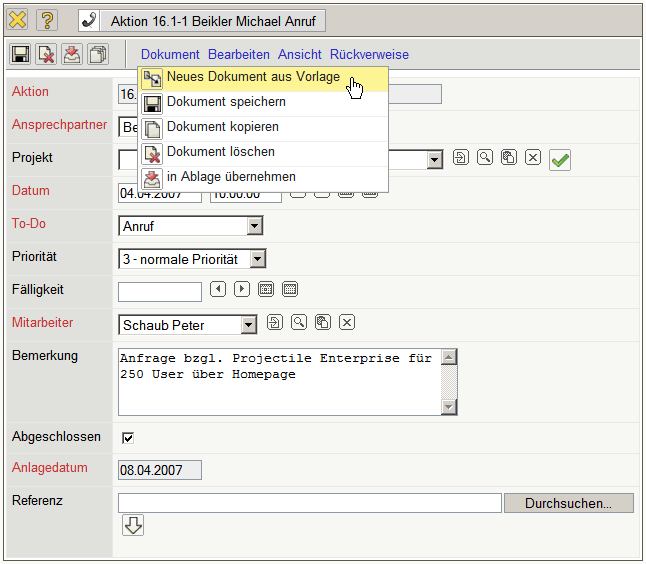 Das System erzeugt ein neues Dokument vom Typ “Aktion” und belegt den Ansprechpartner und einige andere Werte automatisch vor.