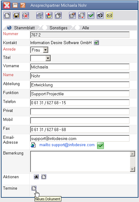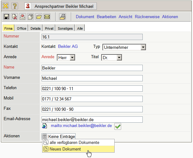 Diese Aktionen werden mit Hilfe der Funktion “Neues Dokument” in dem Dokumenttyp “Ansprechpartner” definiert: