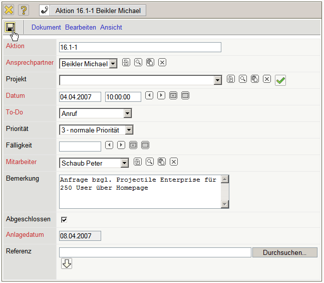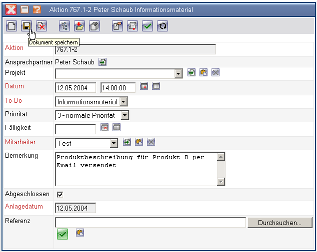 Nach dem Füllen der relevanten Felder wird das Dokument abgespeichert. Im Beispiel wird eine passive und bereits erledigte Aufgabe “Anfrage” protokolliert.