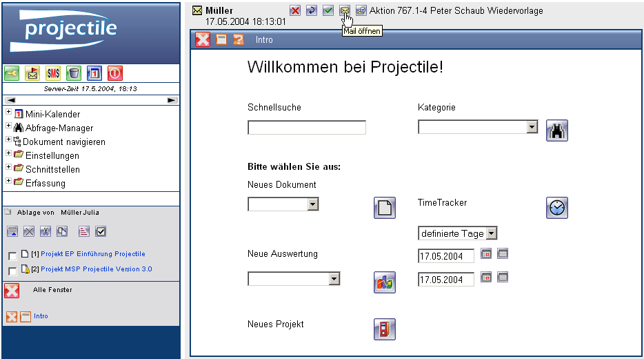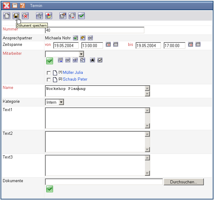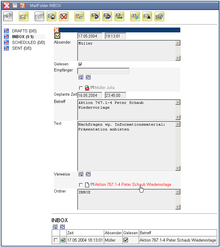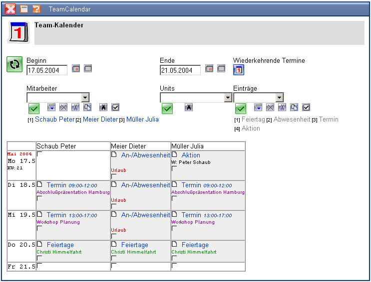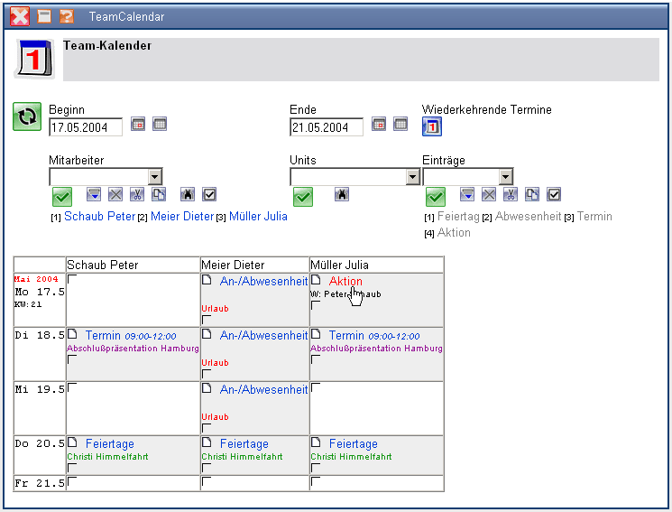 Wenn die optionale Komponente TeamCalendar verwendet wird, erscheint diese Aktion auch im Gruppenterminplaner (hier als Termin von Müller Julia am 17.05.2004) und kann von hier geöffnet werden.