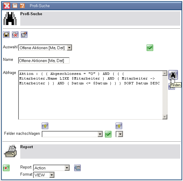 Wenn die optionale Komponente ReportMaker verwendet wird, kann auch in Kombination mit einer Profi-Suche ein eigener Report verwendet werden.