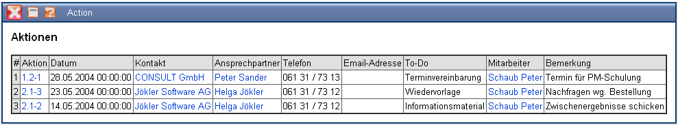 Für jeden Ansprechpartner können beliebig viele Aktionen definiert werden. Aktionen können beispielsweise Anfragen, Terminabsprachen, Wiedervorlagen oder ähnliches sein. Diese Aktionen protokollieren wichtige Ereignisse mit (Historie) und können darüber hinaus für die Akquise und Kundenpflege verwendet werden.