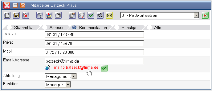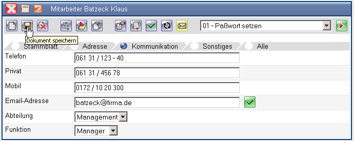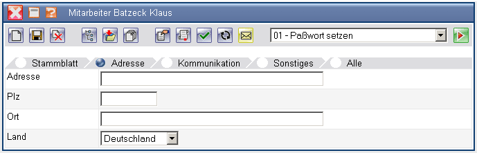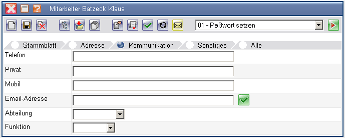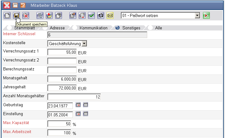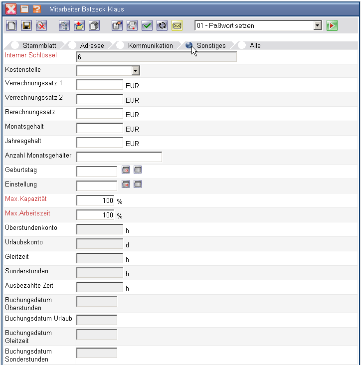 Nach Eingabe aller relevanten Daten und speichern des Dokumentes, sollte zunächst ein Paßwort für den Mitarbeiter definiert werden. Dieses Paßwort kann später auch vom Mitarbeiter verändert werden.