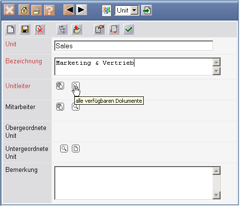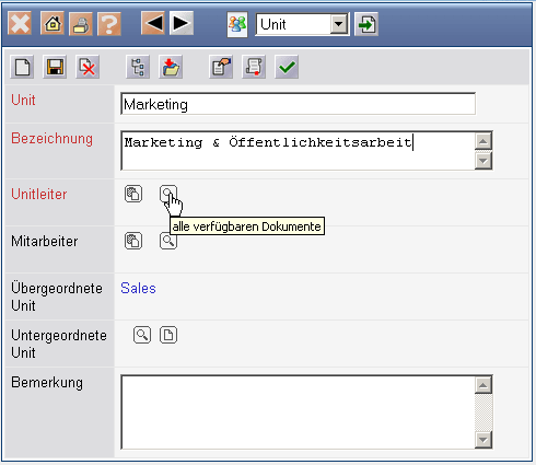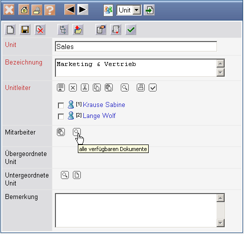 Im folgenden Beispiel wird eine neue Unit “Sales” mit zwei untergeordneten Units definiert. Für die Definition der Unitleiter wird mit Hilfe der Funktionalität “alle verfügbaren Dokumente” eine …