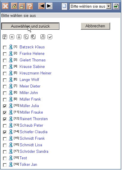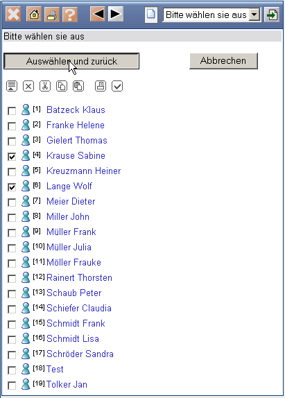 … entsprechende Auflistung aller Mitarbeiter angezeigt. Hier können nun die Mitarbeiter ausgewählt und übernommen werden …
