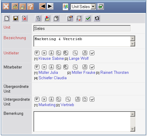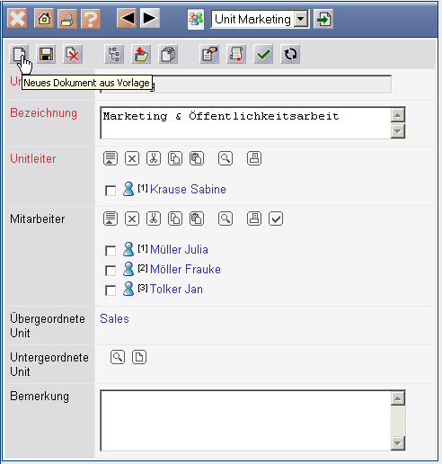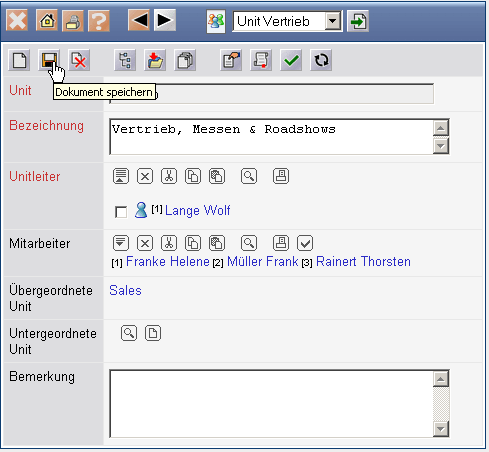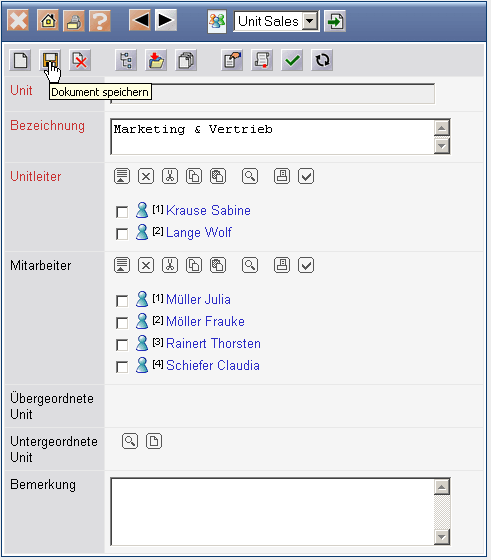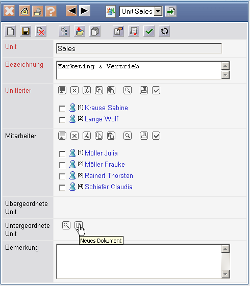 Es besteht die Möglichkeit für diese Unit “Sales”, untergeordnete Units anzulegen. Dazu klickt man auf den Menupunkt “Neues Dokument” in der Zeile Untergeordnete Unit.
