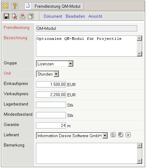 gespeichert. Im Beispiel ist eine neue Fremdleistung “QM-Modul” angelegt worden. Diese “Fremdleistung” basiert auf einer Eigenentwicklung, die je Stück für EUR 2.200,00 verkauft werden sollen. Der interne Preis/Einkaufspreis ist hier ein kalkulatorischer Satz aus der Produktentwicklung.