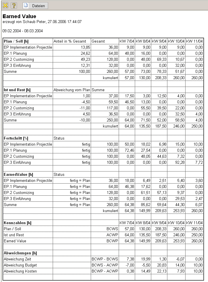 Die Auswertung stellt zunächst in tabellarischer Form die Kennzahlen der Earned Value Analyse dar. Dabei kann der Benutzer im Reiter “Parameter” die zeitliche Periode als Spalte für den Plan, Ist (und Rest), den Fortschritt (Fertigstellungsgrad der aktuellen Periode abzüglich des Fertigstellungsgrades der letzten Periode), den Earned Value und die Kennzahlen sowie die Abweichungen auswählen. Als Perioden stehen hier wöchentlich, monatlich und Quartalsweise zur Verfügung. Mit der Einstellung in Gruppierung wird der Zeilenaufbau bestimmt: (nach Mitarbeiter, nach Phase, nach Tätigkeit und nach Unterprojekt).
