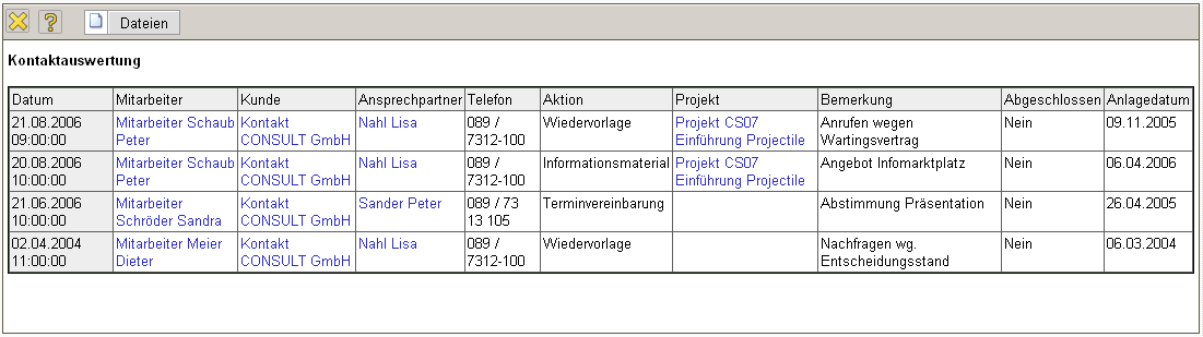 Die Kontaktauswertung liefert eine Übersicht über alle Kontaktdaten im System. Hier werden alle Aktionen nach den definierten Selektionskriterien (beispielsweise alle unerledigten Kontakte) angezeigt. In dieser Auswertung sind die Kontaktdaten (Mitarbeiter, Kunde, Ansprechpartner und Telefonnummer des Ansprechpartners) und die Aktionsdaten (Aktion, Projekt, Bemerkung zur Aktion, Abschlusskennzeichen und Anlagedatum) aufgeführt.