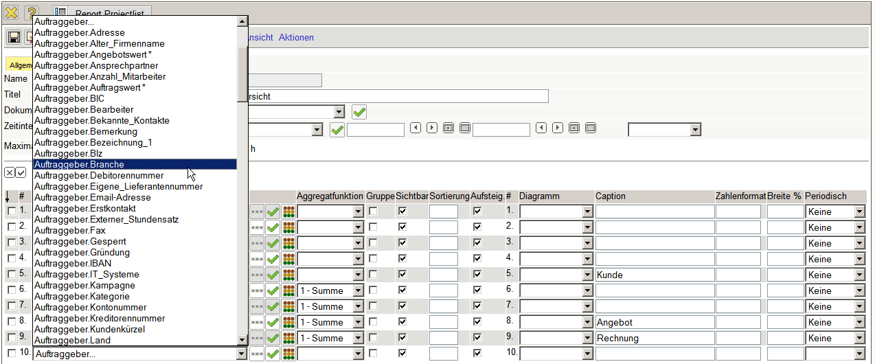 Zunächst wird ein neues Element für den Report mit Hilfe der Funktionalität erzeugt. In der Auswahlliste “Spalteninhalt”, können je nach Dokumenttyp, referenzierte Elemente verfügbar sein. Im Beispiel für den Projektreport ist der Dokumenttyp Projekt ausgewählt. Innerhalb des Dokumentes gibt es das Element Auftraggeber, das aus dem Kontaktsystem herangezogen wird. Diese Verknüpfungen sind auch im ReportMaker nutzbar. Wenn ein Feld innerhalb der Auswahlbox “…” enthält, können mit Hilfe der Funktionalität die verfügbaren Elemente des verknüpften Dokumentes ausgewählt werden.