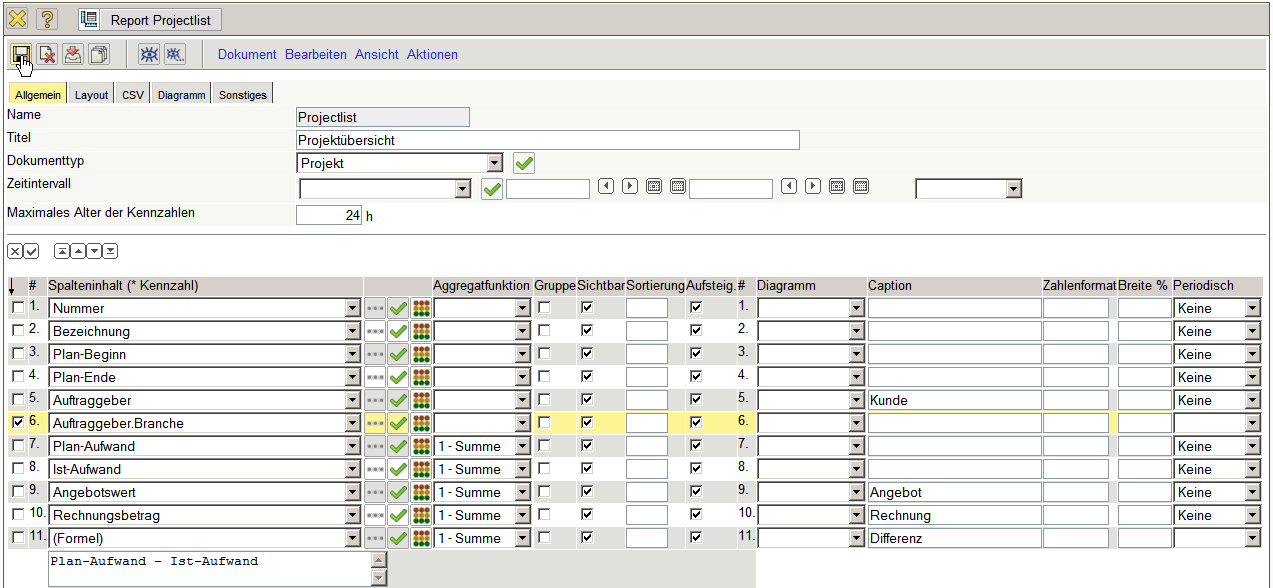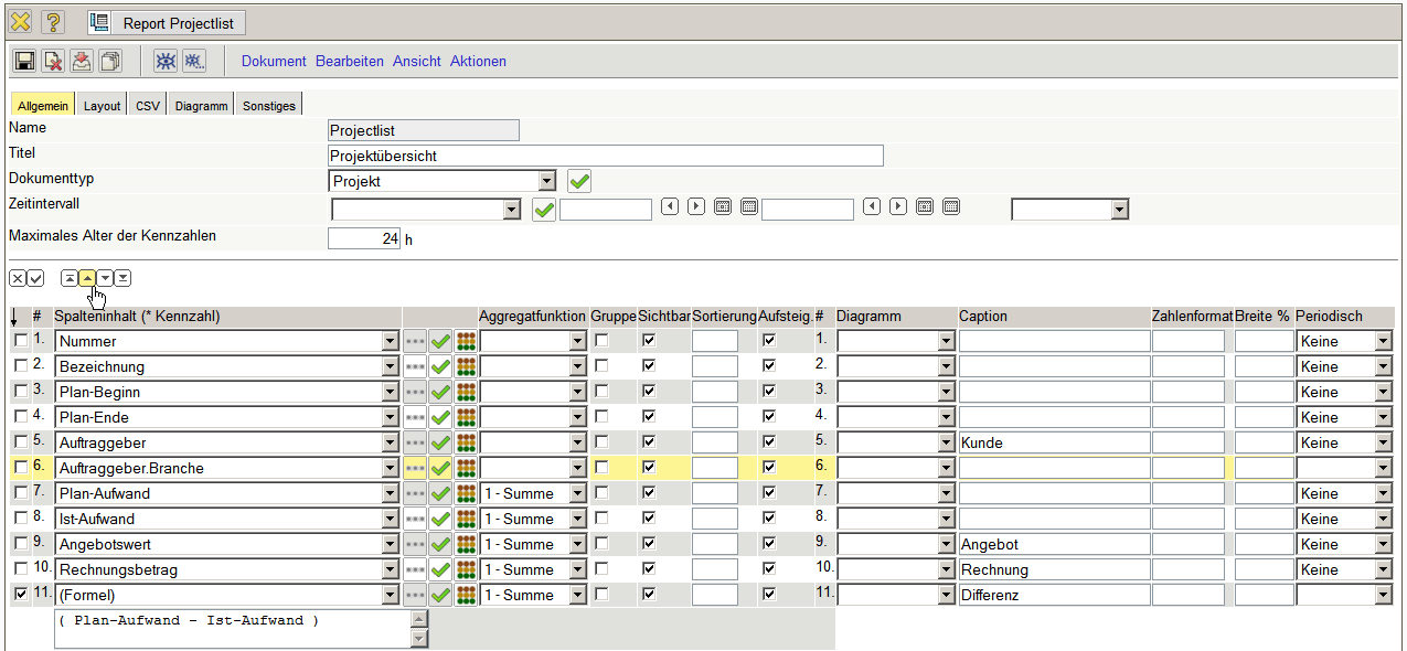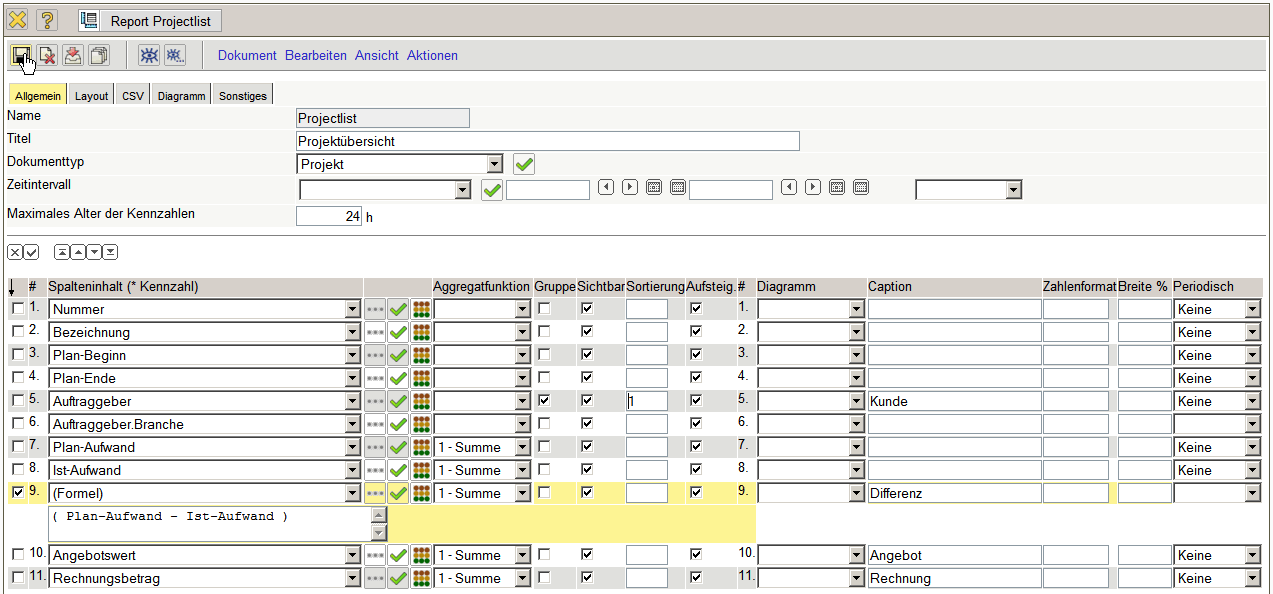 Innerhalb der Formel können alle Grundrechenarten (+,-,*,/) verwendet werden. Bei der Definition der Formeln muss aber stets auf die richtige Schreibweise (auch Groß-/Kleinschreibung) geachtet werden. Im Beispiel soll ein neues Feld mit dem Namen “Differenz” erzeugt werden, das aus den Feldern Plan-Aufwand - Ist-Aufwand berechnet und summiert werden soll (Aggregatsfunktion).