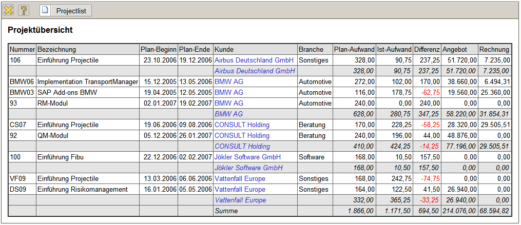 … und liefert dann über alle, nach Kunden sortierten Hauptprojekten, folgende Auswertung: