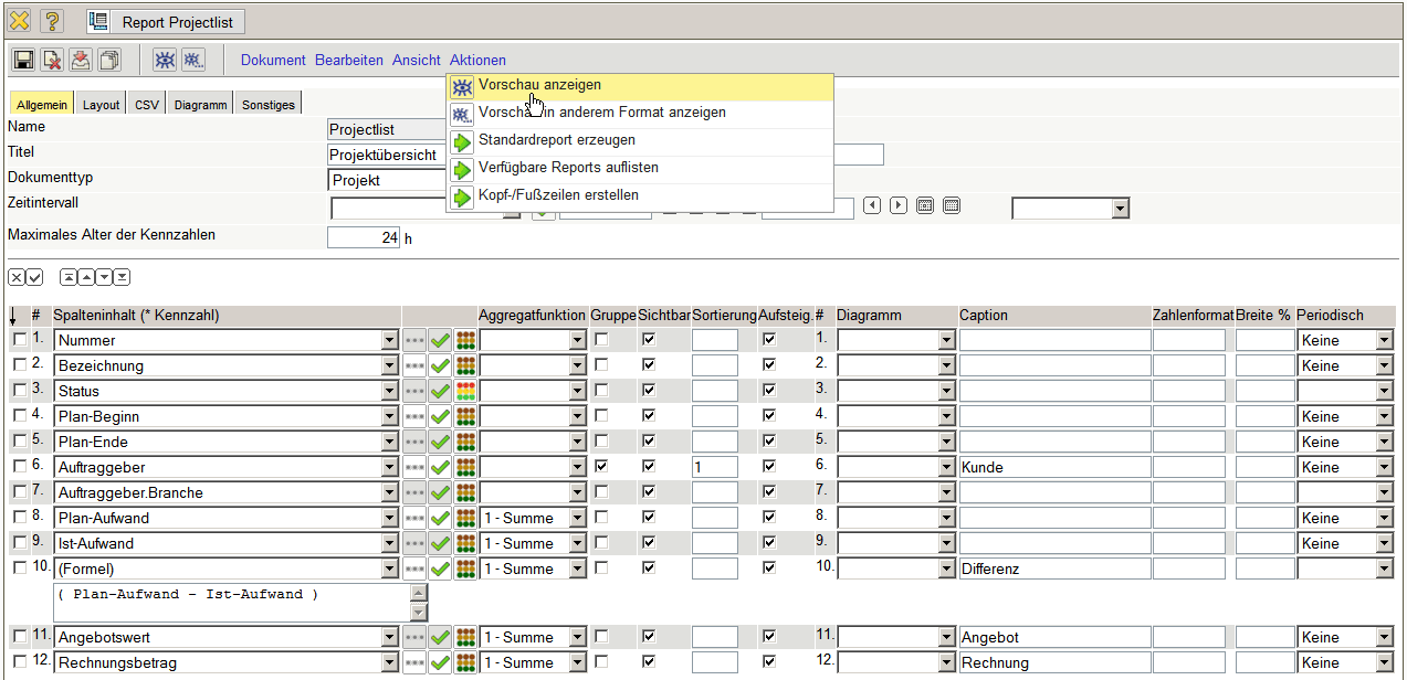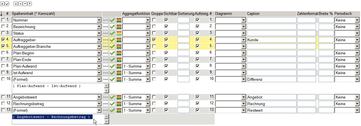 Anschließend werden in den Report noch einige Felder umsortiert und mit Hilfe der Funktionalität eine Formel definiert. Die neue Spalte 13 soll das Ergebnis (Restwert) aus der Differenz vom Angebotswert und den Rechnungsbetrag sein und summiert werden.