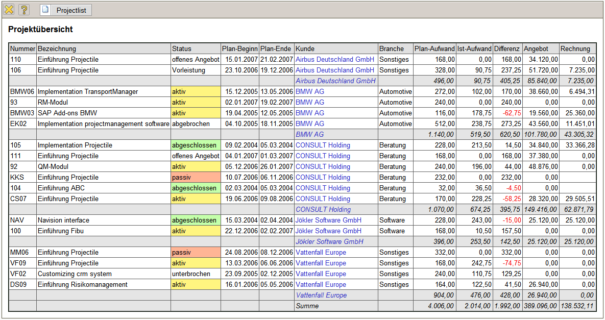 Alle Statusinformationen die den Wert “Live” beinhalten werden mit grüner Hintergrundfarbe umgesetzt (also alle Projekte die beendet sind).