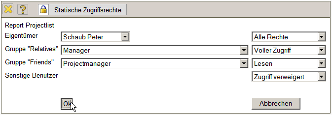 … Manager und Projectmanager vergeben. Alle anderen Gruppen (mit Ausnahme des Owners) haben keinen Zugriff auf diesen Report.
