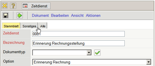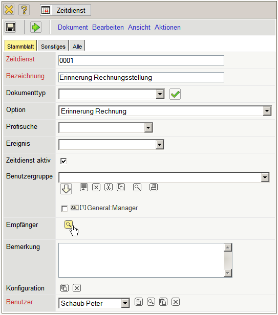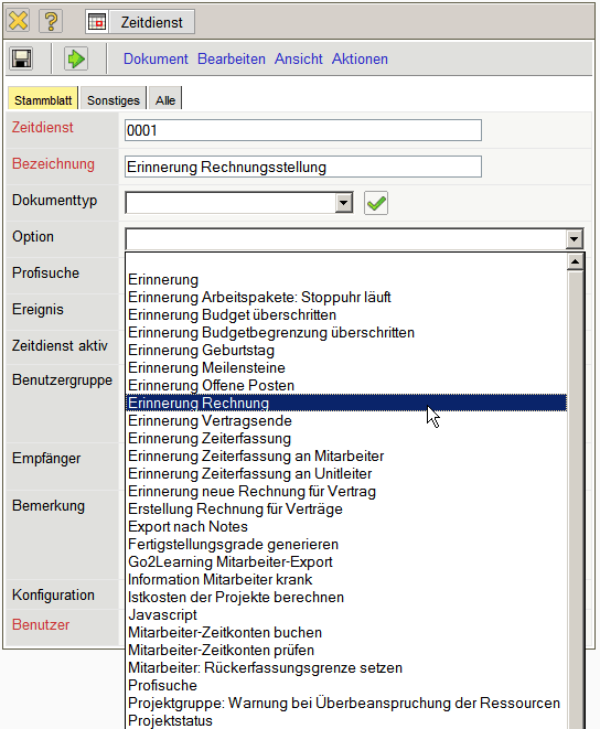 Im Beispiel wird die Option Erinnerung Rechnung ausgewählt. Dieser Zeitdienst versendet eine Mail, wenn eine vorkonfigurierte Rechnung (beispielsweise aus Verträgen) zur Rechnungsstellung fällig ist.