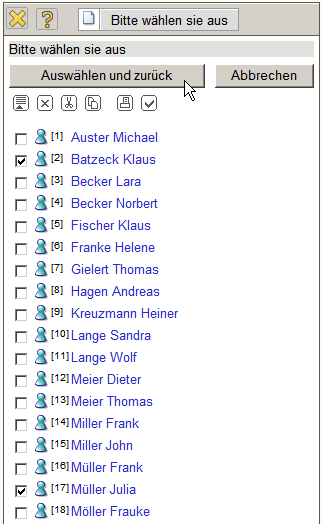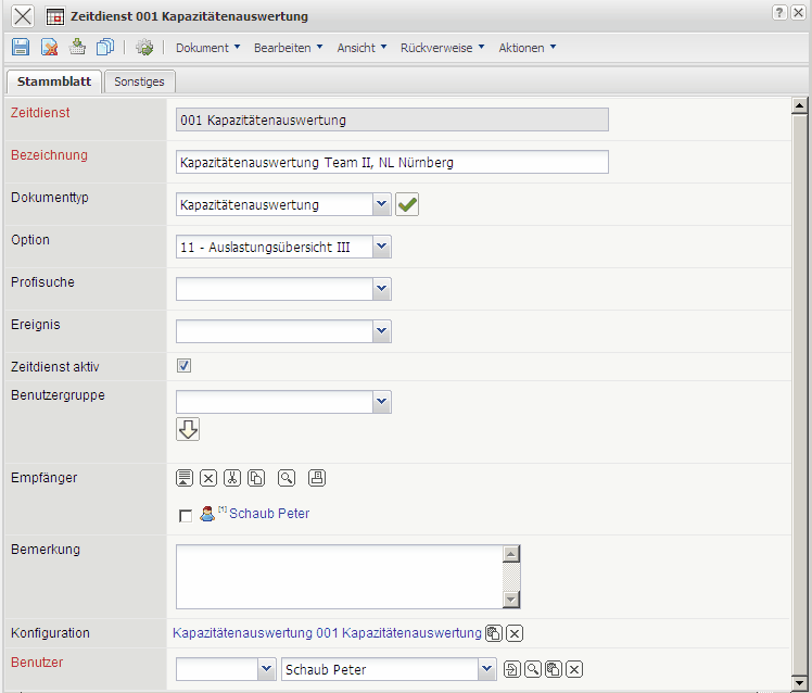 … sowie die Mitarbeiter Batzeck und Müller). Es können sowohl einzelne Mitarbeiter als auch Gruppen als Empfänger des Zeitdienstes definiert werden.