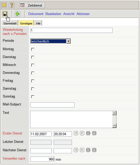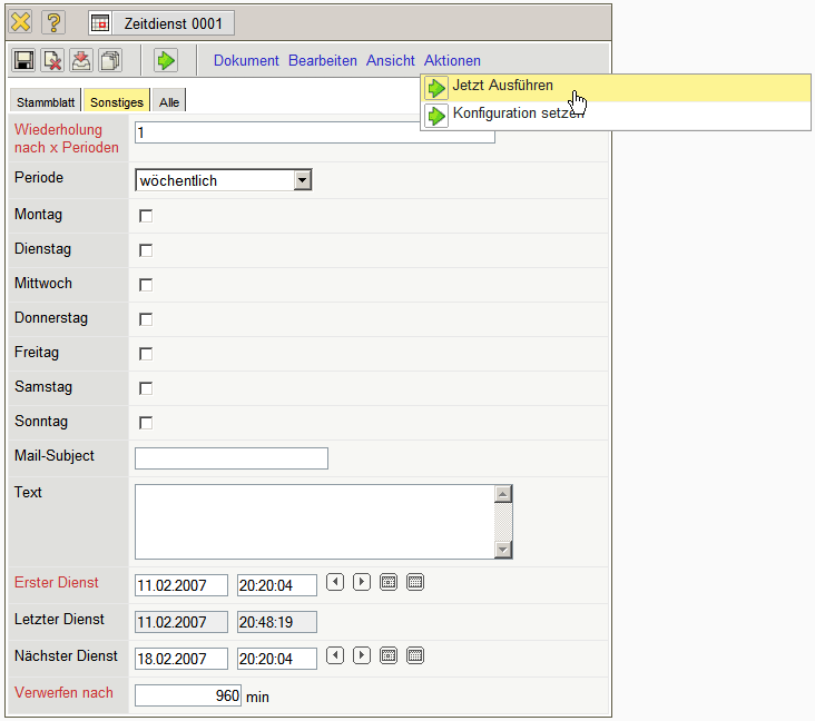 Im Dokumenttyp Zeitdienst werden die Systemdienste für periodische Aktionen in Projectile verwaltet. Hier können Systemabläufe, wie Auswertungen, Datenaustausch, Erinnerungen, Statusberichte oder Rechnungsstellungen, automatisiert werden. Diese Funktionen werden vom System für bestimmte Benutzergruppen zur Verfügung gestellt und können vom Administrator zeitlich gesteuert werden.