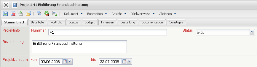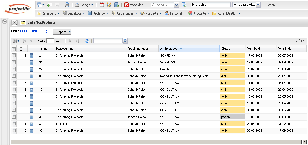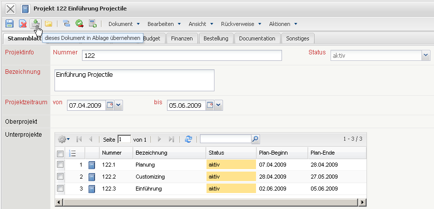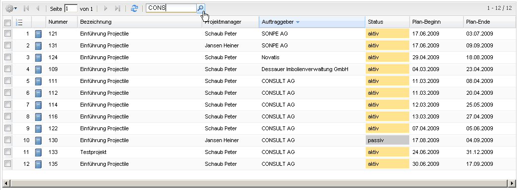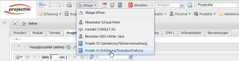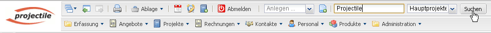 Das zweite Beispiel zur Nutzung der Dokumentensuche zeigt die Möglichkeit an, innerhalb eines Dokumenttyps (Kategorie) nach einem bestimmten String zu suchen, die Suche also weiter einzuschränken: Im Beispiel möchte der Benutzer alle Dokumente des Typs Hauptprojekt auflisten, in denen der String “Projectile” vorkommt …