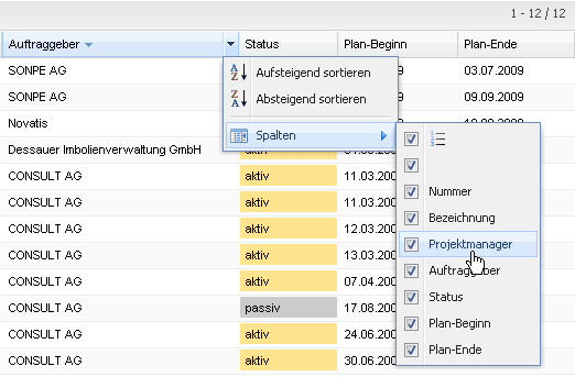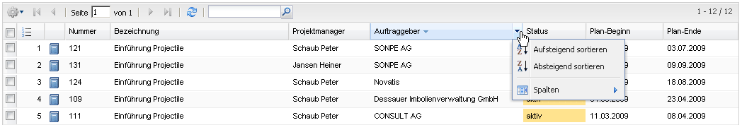Die Spalten der Liste können verschoben und in der Größe verändert werden. Hier im Beispiel wird die Spalte Status …