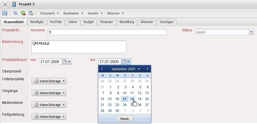 Der Projektzeitraum (von und bis) kann direkt oder mit Hilfe von (Datums-Controlls) eingegeben werden.