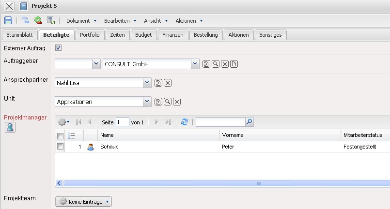 Nach der Definition der Felder des Reiters “Stammblatt” wird auf den Reiter “Beteiligte” gewechselt und die Felder Kontakt, Ansprechpartner und Unit gefüllt. Als Projektmanager wird vom System automatisch der Mitarbeiter eingetragen, der das Projekt erstellt hat, diese Auswahl ist jedoch änderbar und es können auch mehrere Projektmanager zugeordnet werden.