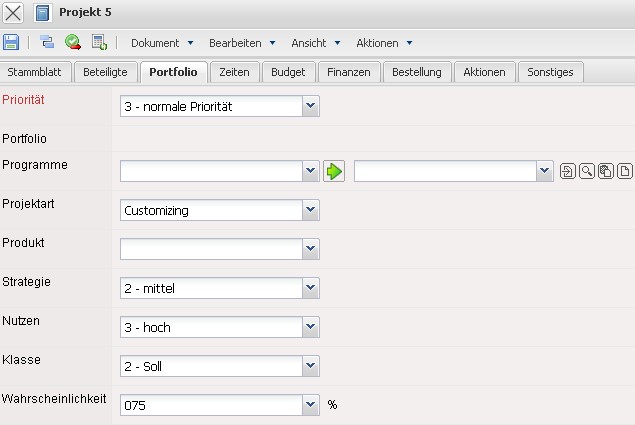 Nach der Definition der Felder des Reiters “Beteiligte”, wird auf den Reiter “Portfolio” gewechselt. Hier werden die Priorität, Projektart, Projektwahrscheinlichkeit und weitere Attribute definiert. Die Wahrscheinlichkeit wird beim Vorschlagswesen verwendet und die Attribute dienen als Klassifizierungsmerkmale und können bei Auswertungen als Selektionskriterien verwendet werden.
