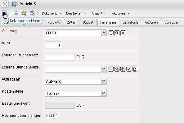Im Reiter “Finanzen” werden u.a. die Projektwährung, die Auftragsart und die Kostenstelle (ggf. der Kostenträger) des Projektes definiert.