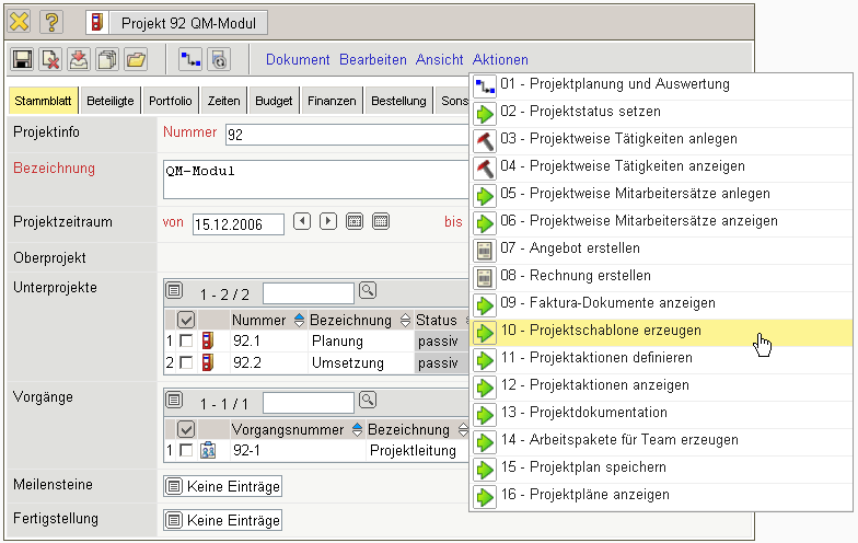 … wird die gesamte Projektstruktur angelegt. Mit Hilfe der Aktion “01 - Projektplanung” kann die Struktur eingesehen und verändert werden.