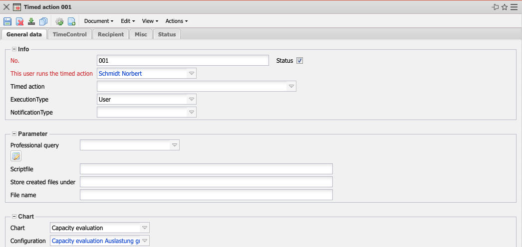 - This User runs the Timed Action: This field indicates who is the main user of the timed action. When creating evaluations, the rights of the creator are taken into account!