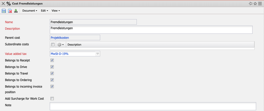 The mask cost element manages the groupable cost elements for budget management and cost entry. The system distinguishes between project costs and overhead costs, which can be subdivided as required. Some project costs (travel expenses, travel costs, external activities) are mandatory and cannot be deleted (like the overhead cost elements Project costs and Overhead costs). You define the grouping of cost elements using the overhead cost element.