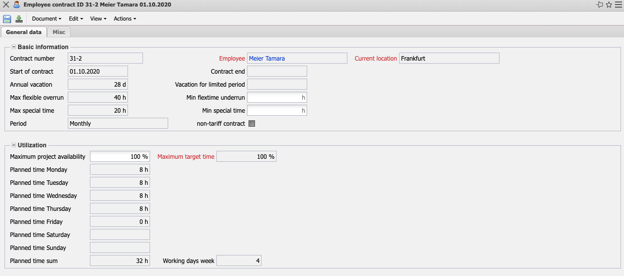 The mask employee contract manages the working time contracts of employees. The contracts are used to map employee master data such as the contract term, leave entitlement, flextime buffer, daily working times and maximum capacity. The contracts have a defined validity. If no valid contract is assigned, the system uses the master data from employee administration. Once defined, contracts can only be deleted or limited.