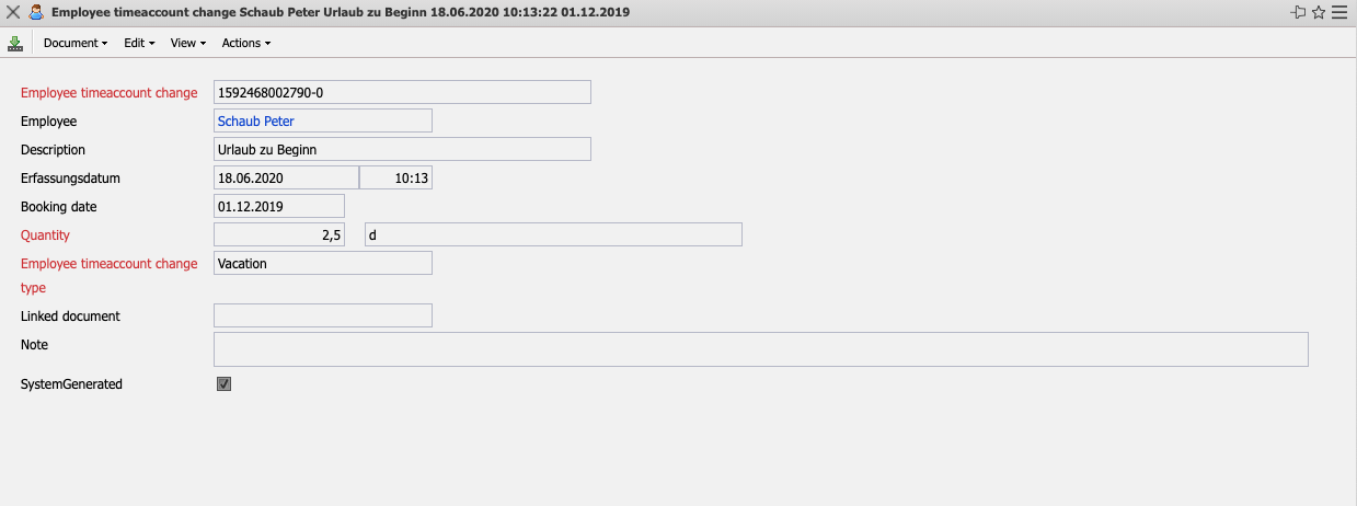 The mask employee timeaccount change records and manages the different time bookings in the system. The various time postings are entered in the employee mask using the Post time accounts action. Hours can be added or deducted for the accounts special hours, flextime, overtime and vacation. In addition, the corresponding time posting from which the transaction was posted or debited is displayed.