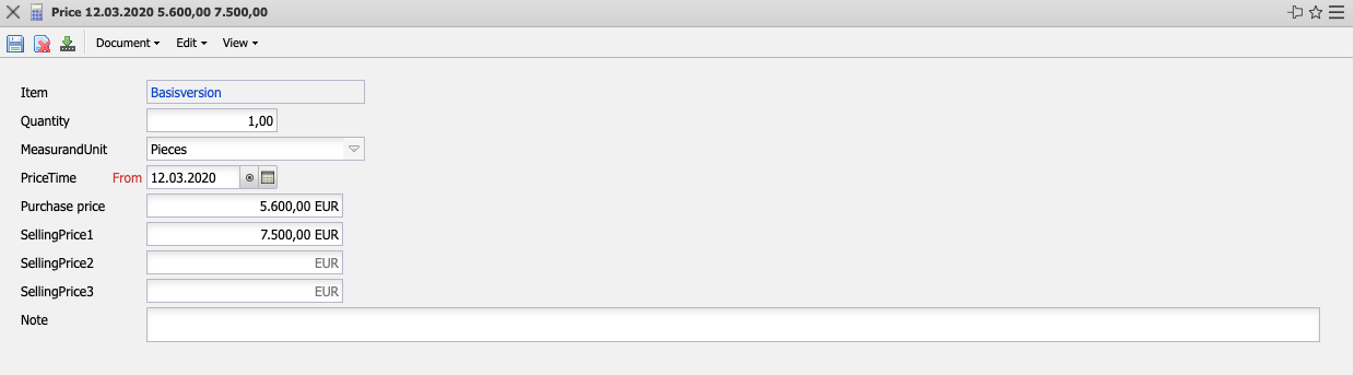 The Price mask manages the article prices in the system if there are prices that differ from the purchase and sales price. These prices are valid and have up to three price levels.