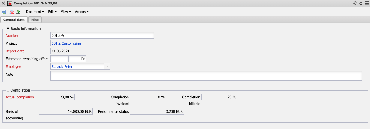 • Project: In this field, you select the project for which you want to provide an estimate of the degree of completion. The projects can be defined and changed in the mask project.
