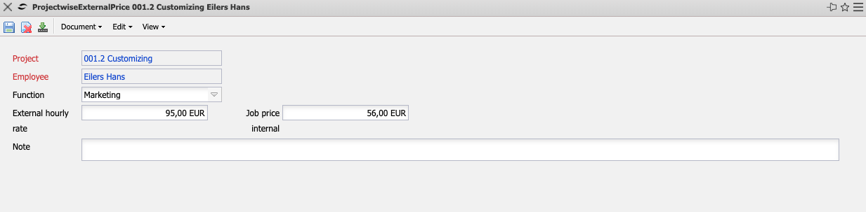 The mask project-wise external price manages the activity records that are adjusted for a defined project. If these records are defined for a project or sub-project, these values override the global employee record (see also cost and pricing).