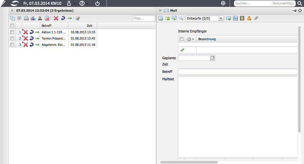Projectile beinhaltet im optionalen Groupware-Modul eine interne und externe Mailfunktionalität. Mit Hilfe des integrierten Mailsystems “Mailer” können systemweit Mails und Kurznachrichten versendet werden. Die internen Mails können direkt auf beliebige Dokumente im System verweisen und automatische Nachrichten für Wiedervorlagen (siehe auch Kontaktsystem) oder Erinnerungen an Termine (siehe auch Team-Kalender) erzeugen. Darüber hinaus ist das Mailsystem im Kontaktsystem und der Mitarbeiterverwaltung integriert.