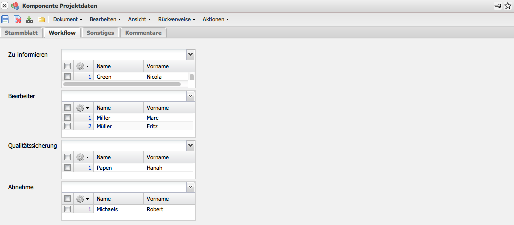 - Zu informieren: Hier werden alle Mitarbeiter übertragen, die bei Statusänderungen innerhalb der Komponente (auf Basis der Änderungsanträge) informiert werden sollen. Die Information geschieht mit Hilfe des Mailsystem “Mailer”.