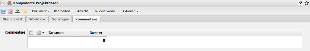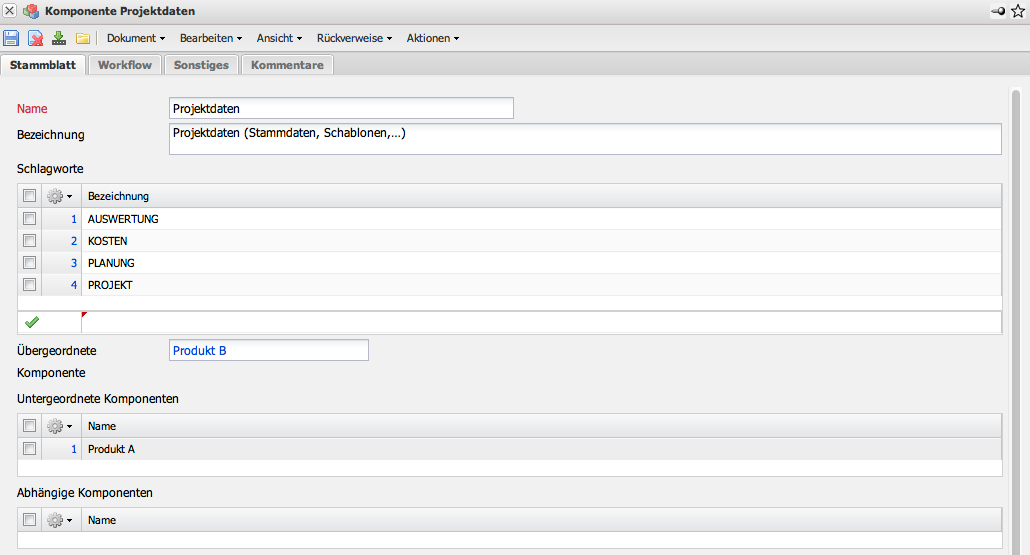 - Projekte: Im Feld Projekte kann eine Zuordnung der Komponente zu einem oder mehreren Projekt vorgenommen werden. Die Projekte können in dem Dokumenttyp Projekte definiert und geändert werden.