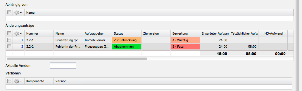 - Änderungsanträge: Dieses Feld beinhaltet alle direkt zur Komponente zugeordneten Änderungsanträge . Diese Tickets definieren Änderungsanträge (Erweiterungen, Reduzierungen, Fehlerbehebungen, …). Die Änderungsanträge werden in der Maske Änderungsantrag verwaltet.