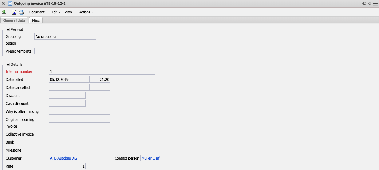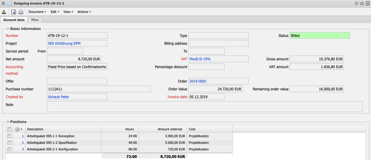 The mask Invoice realizes the invoicing in the system. The (outgoing) invoice contains, among other things, information on the invoice description, project, creator, status of the invoice, service interval, net amount, sales tax, total amount, cash discount, billing type and invoice date.