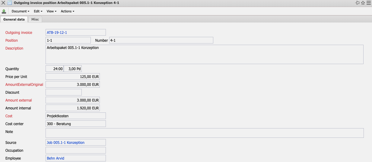 • Description: The description of the invoice item is entered in this field. By default, the system stores the descriptions of the underlying work packages and items from travel, travel expenses and material costs entry here.