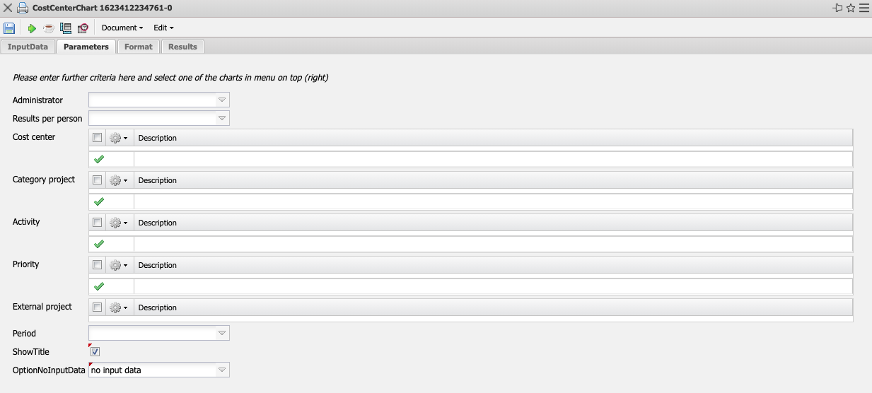 - Cost Center: In this selection box you can choose cost centers as selection criteria. These cost centers refer to the cost center of the projects and restrict the selection of the projects considered accordingly (only projects that are assigned to this (these) cost center(s) are displayed).