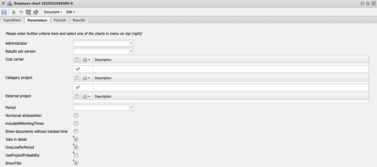 - One Line per Time Recording: This indicator controls whether one line per time recording should be displayed in the generated evaluation. If the indicator is not set, one line is displayed per work package.