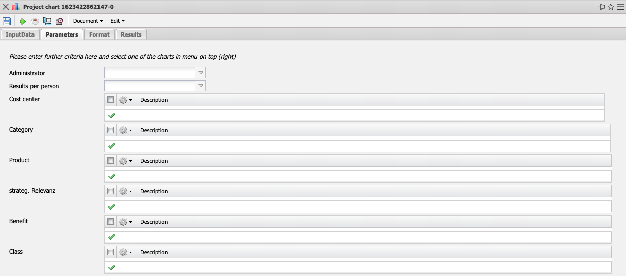 • Product, Strategic Relevance, Utility, Class: In these selection boxes you can choose Product, Strategy, Utility and Class as selection criteria. These selections refer to the fields of the same name in the project.