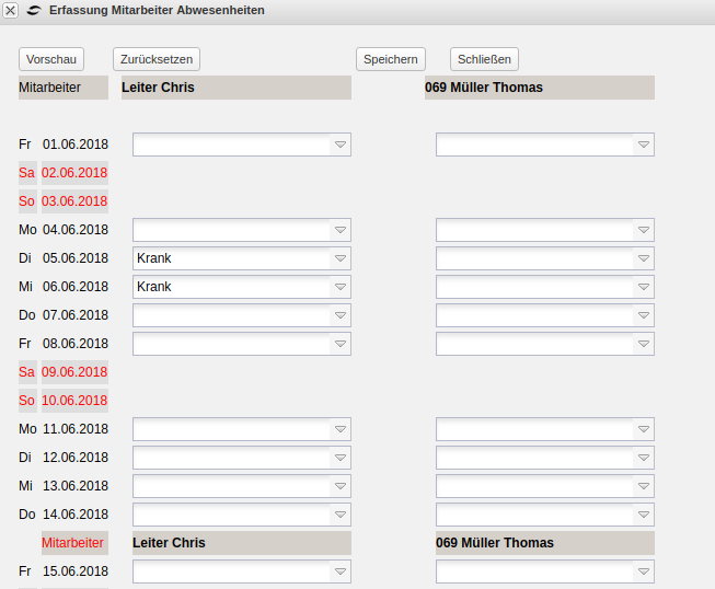 Nun können die Urlaubs- oder Krankheitstage der Mitarbeiter eingetragen und abgespeichert werden.