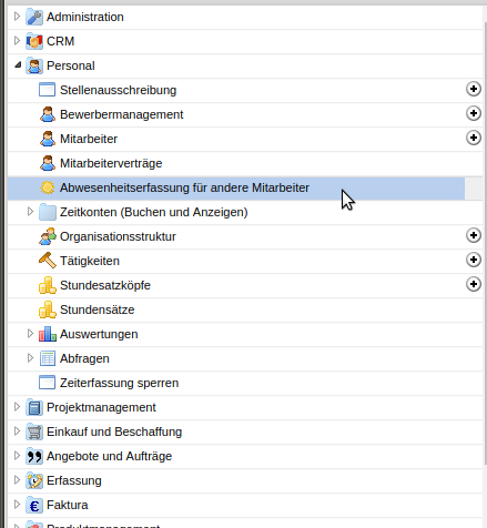 Die Erfassung der Abwesenheiten (Urlaub, Krank, Dienstreise, …) wird u.a. für die Arbeitszeitverwaltung und das Ressourcenmanagement verwendet. Gerade längere Abwesenheiten sollten im System erfasst werden, damit diese Prognosen im Ressourcenmanagement (siehe auch Abschnitt 2.05.04 Kapazitätsauswertung) auf einer soliden Basis stehen.