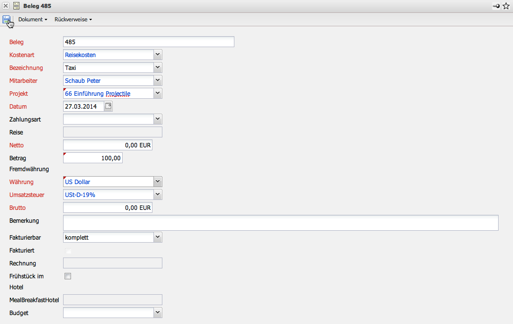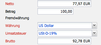 Im Beispiel wird die Zweitwährung auf US Dollar (USD) geändert, der Betrag von 100 USD wird eingeben und nach dem Abspeichern des Dokumentes wird der fehlende Wert …