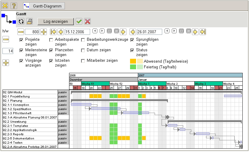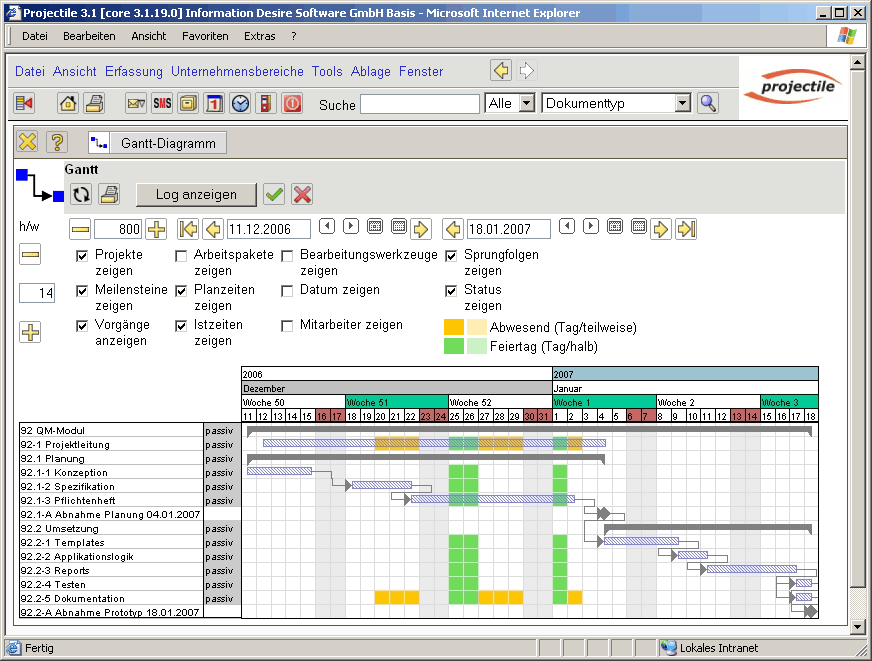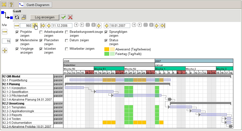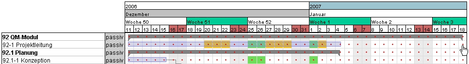 Das System verschiebt nach der Vorwärtsrechnung des Beispiels das Projektende vom 02.02.2007 auf den 18.01.2007. Die Ergebnisse der Berechnung (hier werden keine Mitarbeiterdaten berücksichtigt) werden direkt im Gantt-Diagramm angezeigt. Es ergibt sich aus der Rechnung dann folgender Zustand des Projektplans: