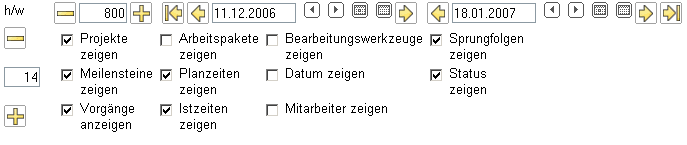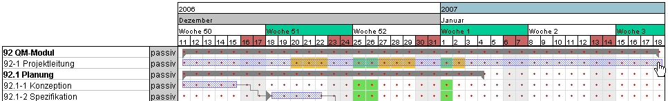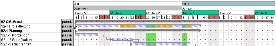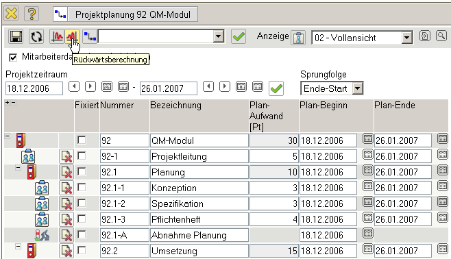 Für das nächste Beispiel werden die Zeiten aller Projektelemente auf das Intervall 18.12.2006 bis 26.01.2007 gesetzt (grüner Haken) und die Rückwärtsrechnung ausgeführt. Bei der Rückwärtsrechnung werden die spätestmöglichen Beginn- und Endzeiten der einzelnen Arbeitspakete ermittelt.